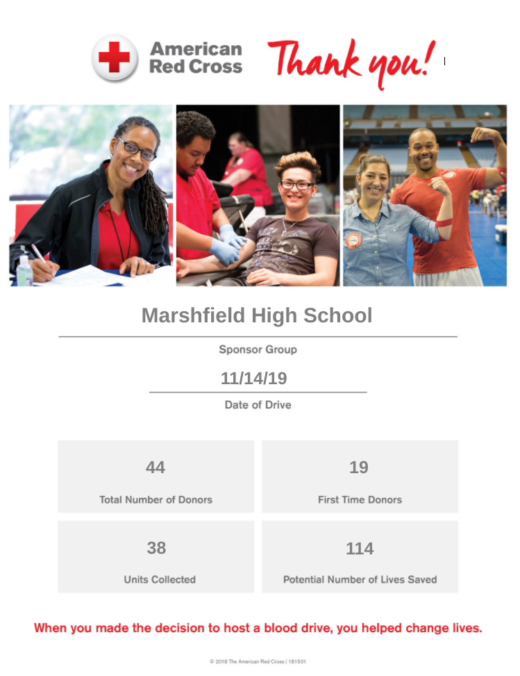 Blood drive a success! Marshfield High School sponsored a blood drive on November 14th. Thirty-eight units were collected, potentially impacting one hundred fourteen lives. Go Pirates!