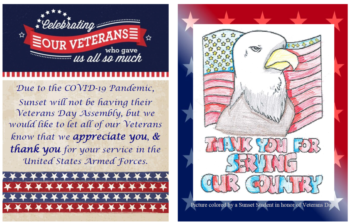 For a number of years, the staff and students of Sunset School take a moment to recognize local veterans in Coos County. Although they were unable to hold their traditional Veterans Day assembly, this did not stop Sunset from showing their appreciation for local veterans. To thank and recognized those who have served in the US Armed Forces, students created art and poetry. Cards were sent out to Veterans to show appreciation and to thank them for their service. Additionally, when you drive by the front of Sunset School you will see art work the 3rd grade class created to recognize veterans on Veterans Day.