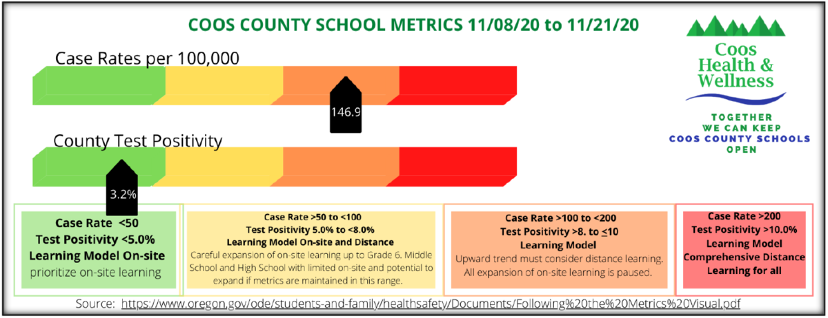 The updated two week look-back metrics have been released. The test positivity rate has continued to stay in the green column. Unfortunately, the case number has continued to climb and is now in the middle of the Orange Zone. Our plans to bring 4th-6th grade students back to in-person hybrid will be pushed back at least a week due to this information. We will continue to operate K-3rd grade in-person and provide “limited in-person instruction” to our 4-12 grade students. We will reassess the metrics next Monday and if they drop back within the Yellow Zone we will look at December 7 as our date to bring 4th-6th grade students back. Please continue to do your part, as well as encourage those around you to do their part, in helping to reduce the spread of the virus.