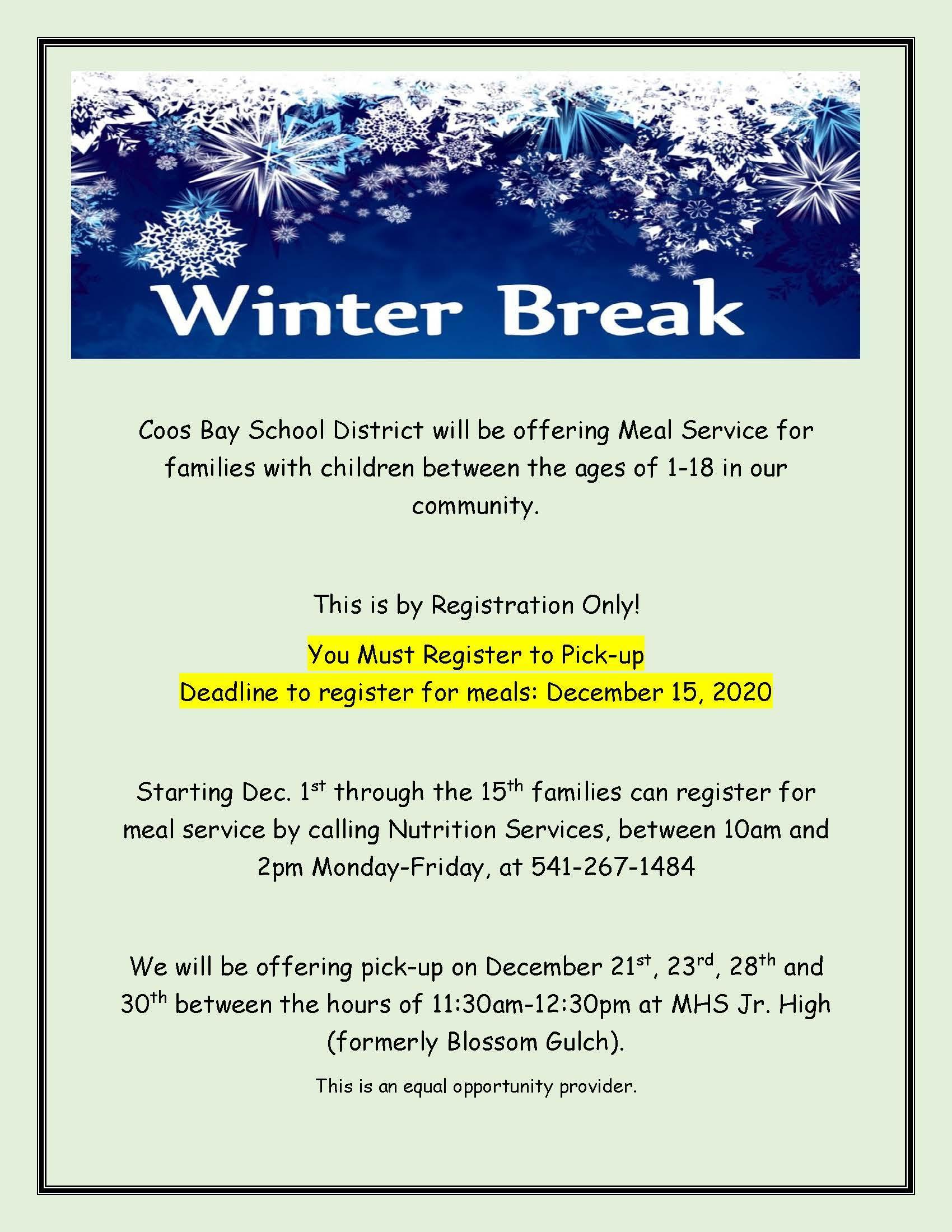 Starting Dec. 1st through the 15th families can register for meal service by calling Nutrition Services, between 10am and 2pm Monday-Friday, at 541-267-1484