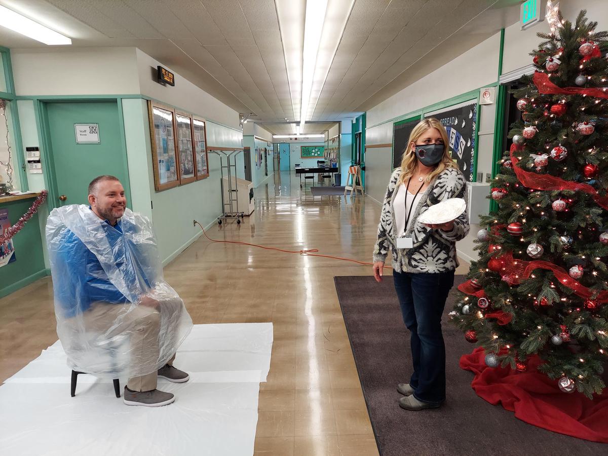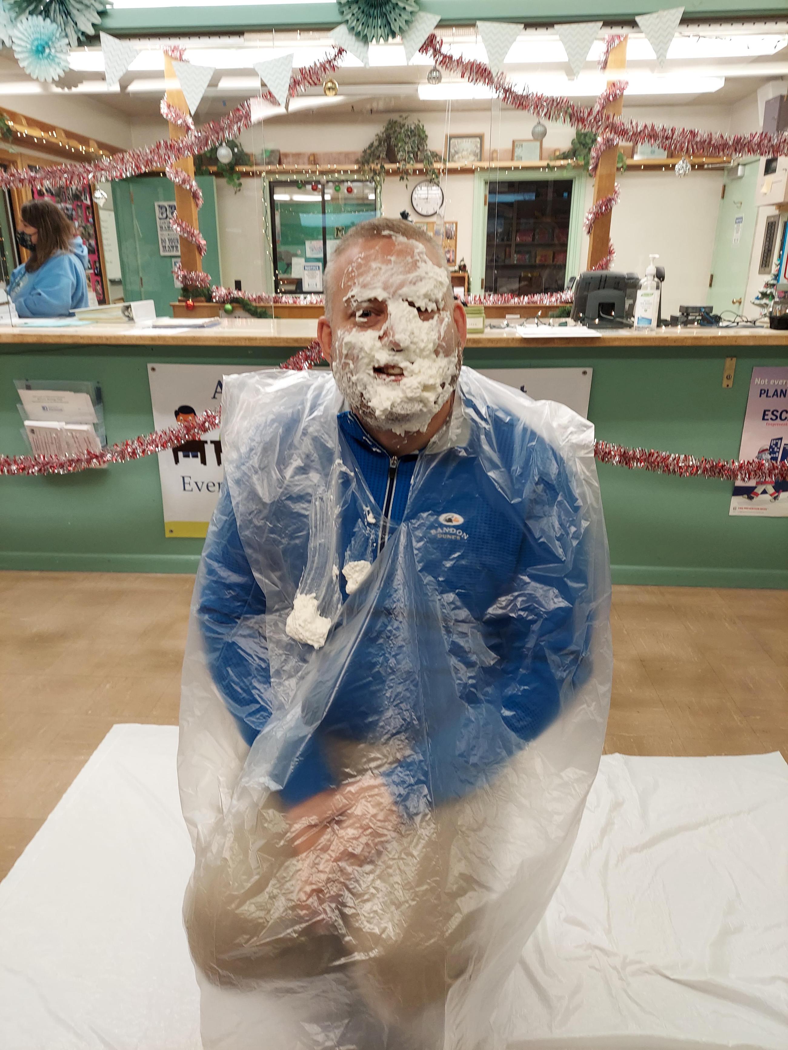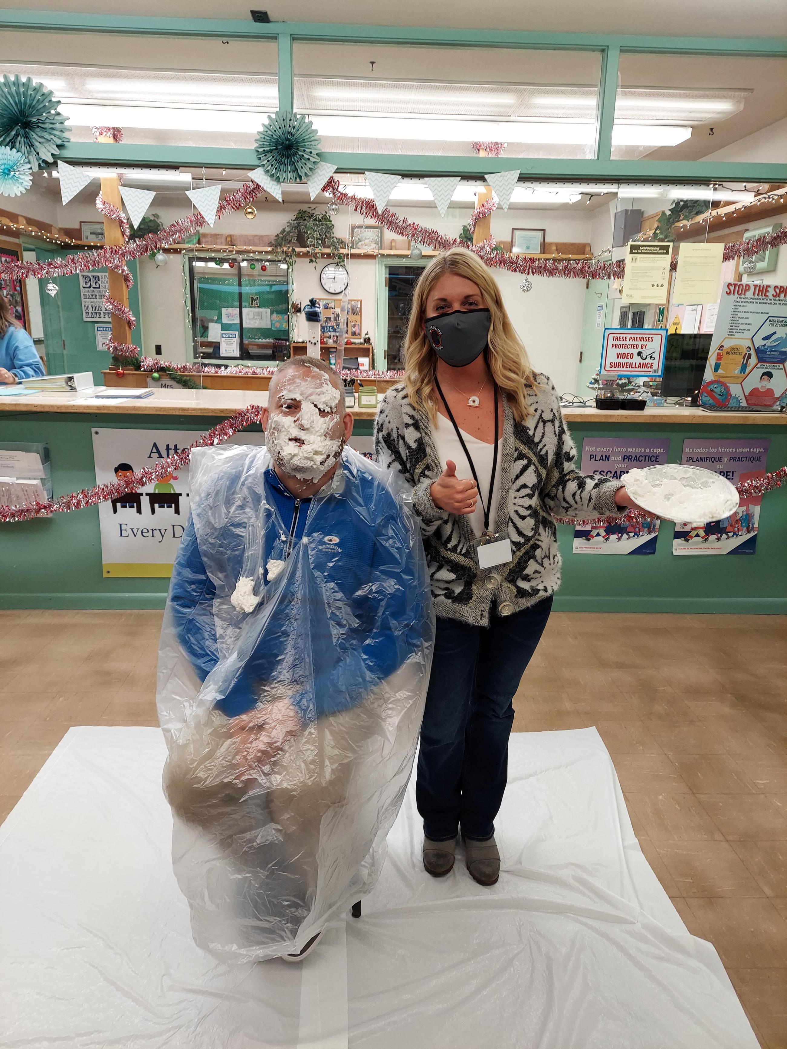 Well, the lucky "victim" on the receiving end of the pieing was Gary Roberts, Millicoma Principal (video link), with the most money in his jar. Gary graciously accepted the "gift" from Kara and took the pie in the face. Thank you, Gary, Kara and Millicoma and Eastside staff for participating in the Pie in the Face fundraiser. I have no doubt that the childhood bond between Gary and Kara is even stronger because of this event. 😁