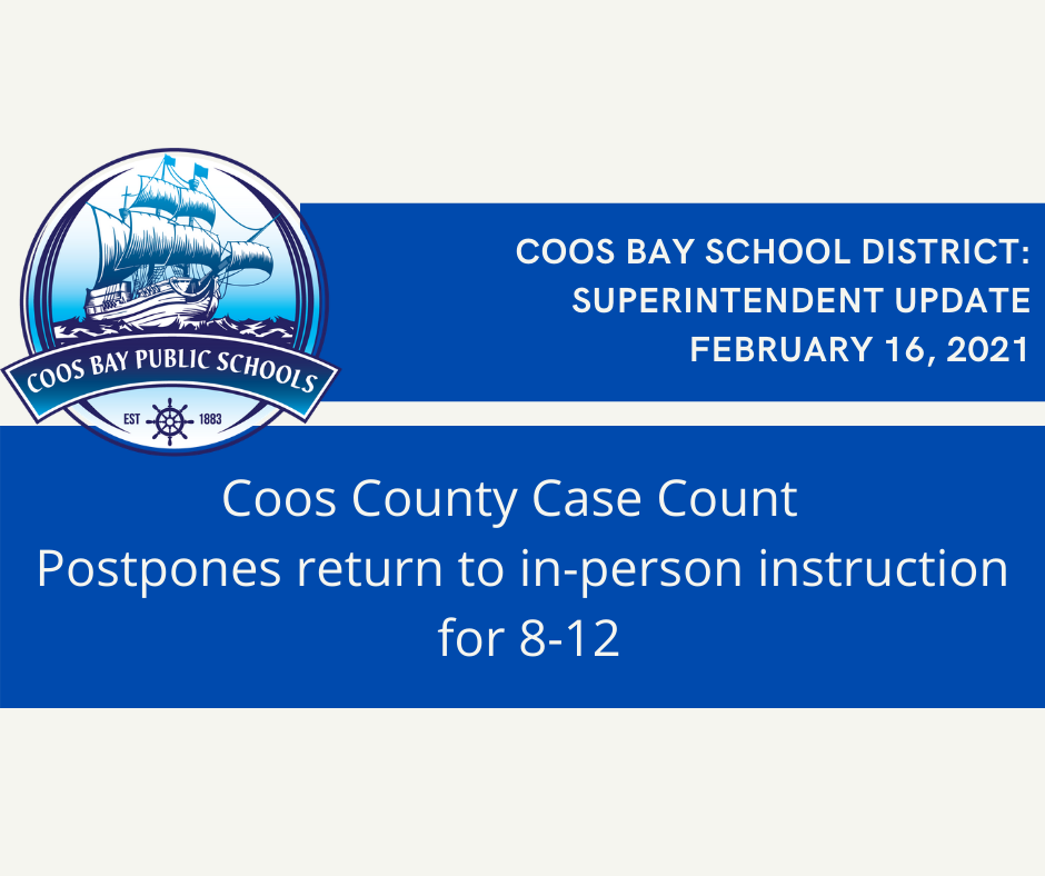 The latest two-week totals were posted for Jan. 31-Feb. 13. Unfortunately, the case numbers are continuing to trend the wrong direction. The latest two-week look back is up eight additional cases which pushed us up to 297 cases per 100,000 residents in Coos County. Last week’s two-week total of actual cases was 180, while this week’s two-week total was 188. This will cause us to postpone the return to in-person instruction for 8-12 to at least March 1. This decision follows the ODE and OHA guidance which states that when cases are trending up that we pause adding our High School students back in-person. The numbers do not require us to pause the grades that we already have in-person. As long as we are able to handle cases that impact our schools by using the safety protocols we have in place and isolating them to prevent spread between classes or cohorts then we can remain open at the K-7 level. We continue to monitor cases daily and I am hopeful that we will soon see a decrease in cases in our county. I will update you again next Monday or if there is new information to share.