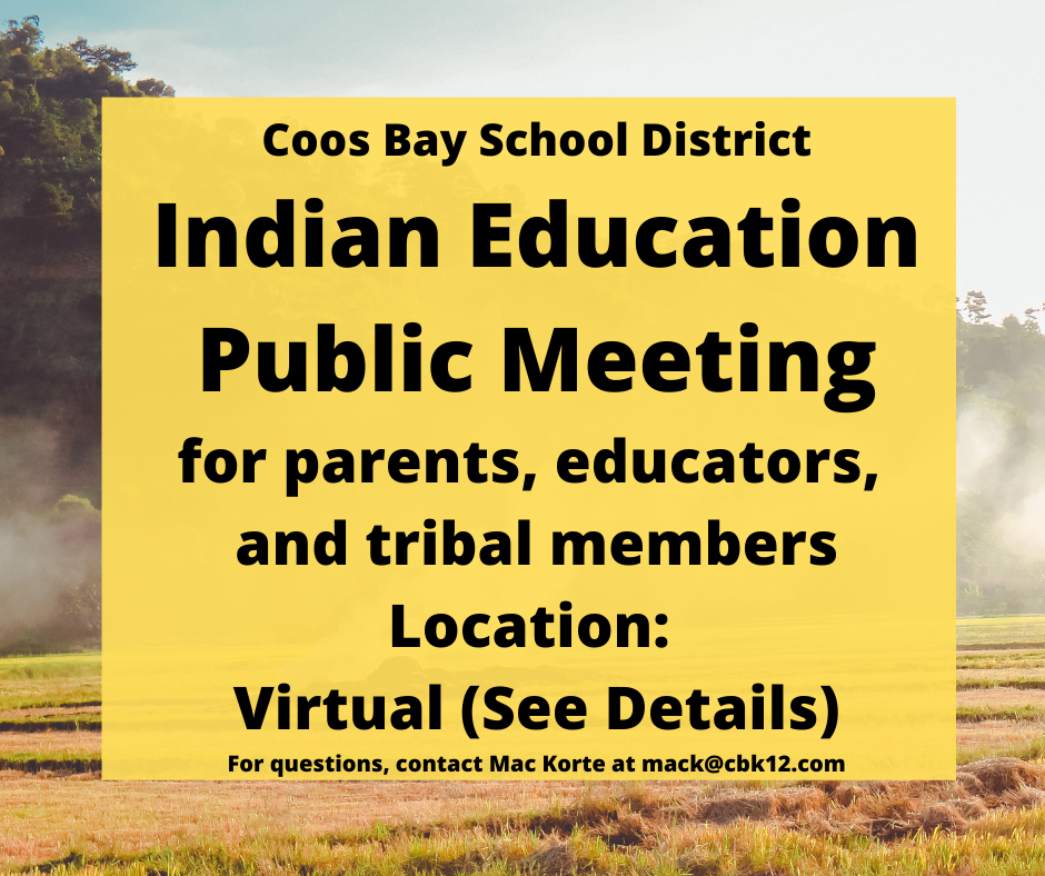 The Coos Bay School District is holding an Indian Education Public Meeting for parents, educators, and tribal members interested in learning about Indian Education within the Coos Bay and North Bend School Districts.