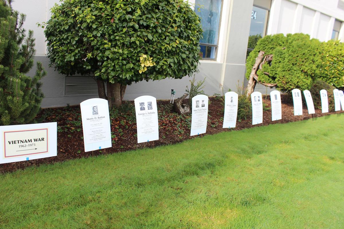 On the lawn near the front entrance of the high school sit 13 white memorial headstones, all remembering young Marshfield students who died during the Vietnam War.