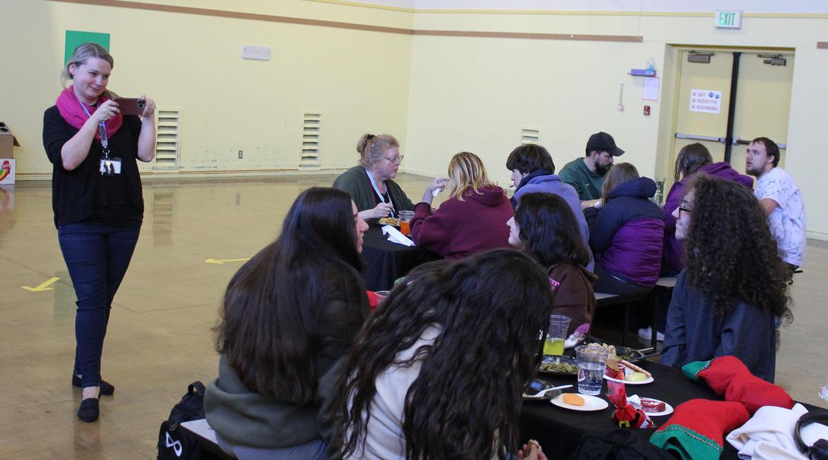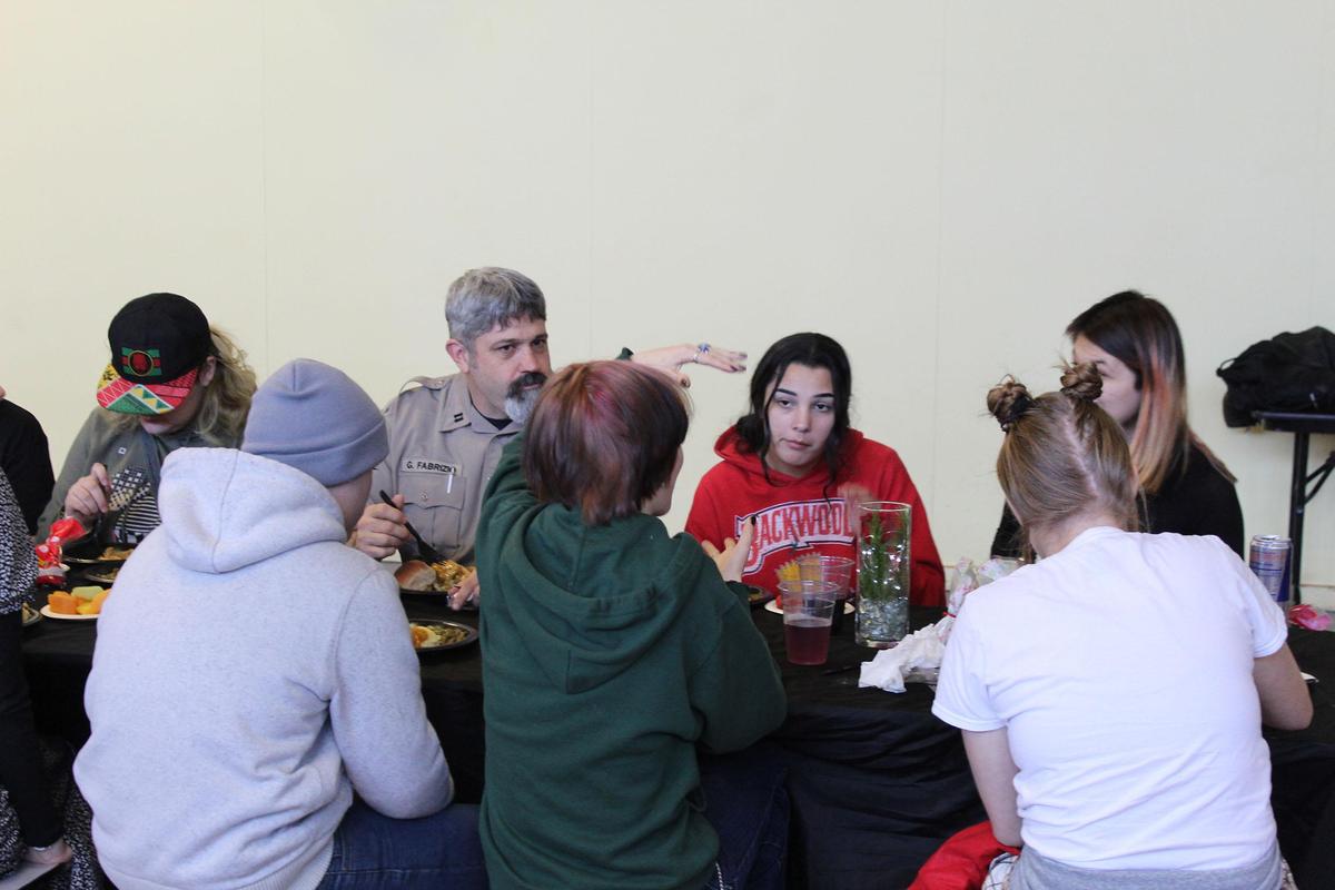 On Thursday, the students came back and had a holiday lunch of turkey, mashed potatoes, gravy, green beans and a roll. But this lunch came with a twist. Reviving a tradition that faded during COVID, representatives from the Coos County Sheriff’s Office came to Destinations and served the students lunch.