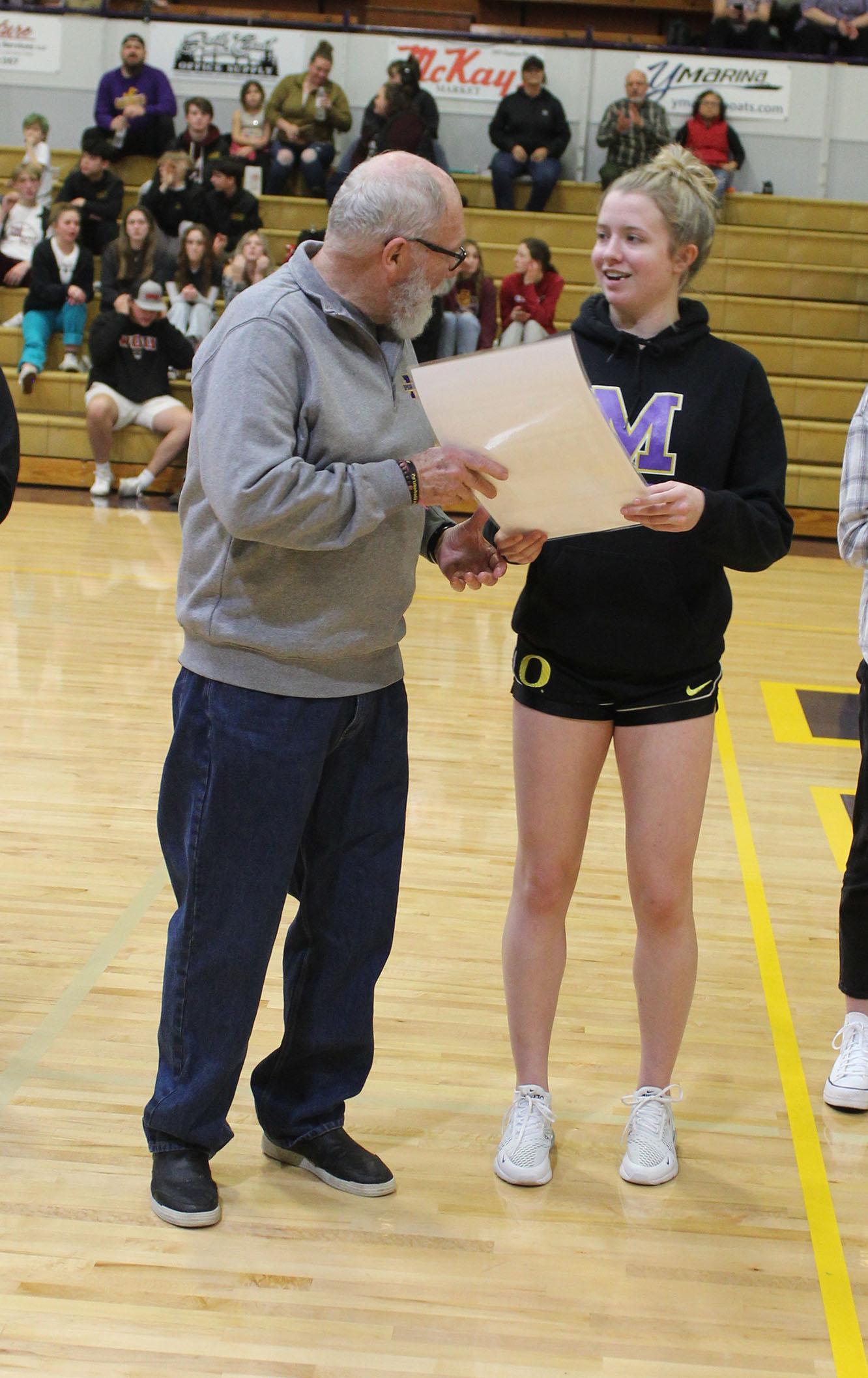 At halftime of the boys game, the 2022 state champion Marshfield volleyball team came back together to say thank you to the Coos Bay School District Board of Directors. The members of the volleyball team each signed a team photo, which was then given to the board members.