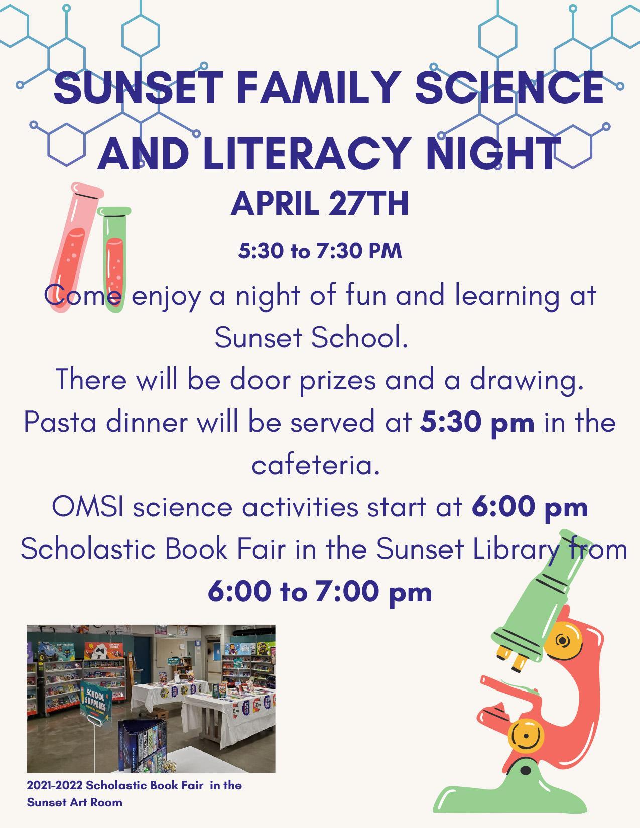 Sunset School will host a night of fun and learning April 27 with the Sunset Family Science and Literary Night.