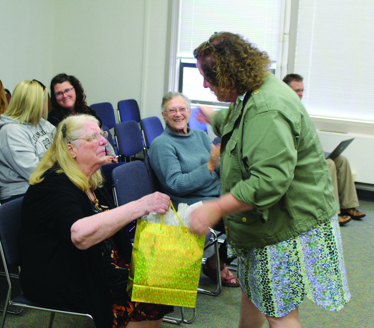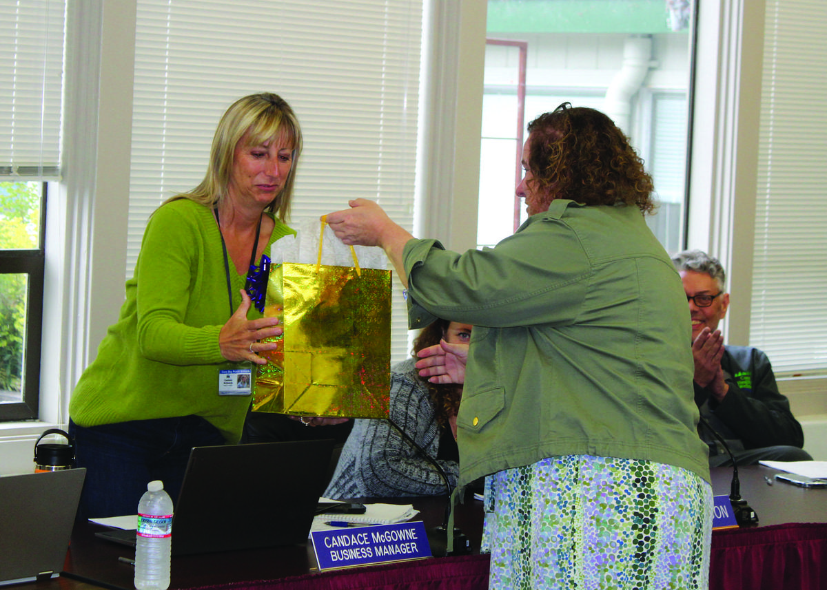 Board Vice Chair Arnie Roblan read bios of the six retirees, and Candace McGowne and Marcia Stewart-Warren, who were in attendance, were presented gifts by Superintendent Charis McGaughy. The remaining employees will have their gifts delivered to them.