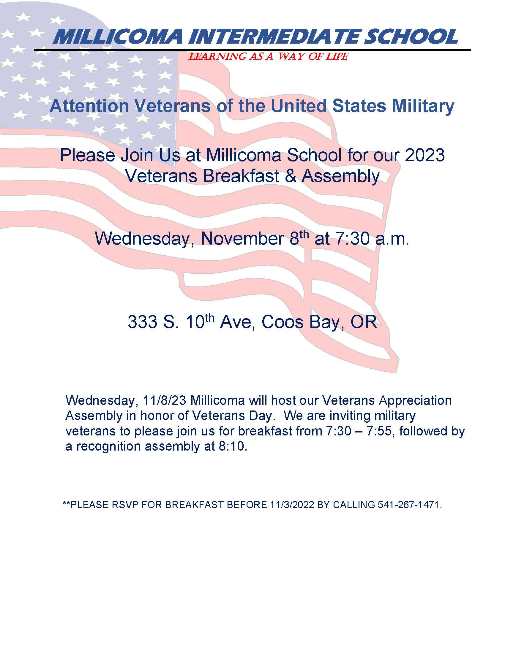 Join us in honoring our heroes! 🎖️ Millicoma Intermediate School invites all United States Military veterans to our Veterans Breakfast & Assembly on Wednesday, November 8th at 7:30 a.m. Come share in this special event as we recognize and appreciate your service. Breakfast served from 7:30-7:55 followed by a special assembly at 8:10. RSVP for breakfast by calling 541-267-1471 before 11/3/2023. See you there at 333 S. 10th Ave, Coos Bay, OR. #VeteransDay #MillicomaAppreciatesVeterans