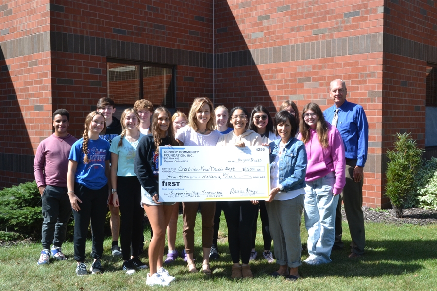 The Convoy Community Foundation recently presented a $5000 donation to the Crestview Music Department which includes the school musical, Knight Vision, middle school swing choir and high school chorus as the direct beneficiaries. The donation will be put to immediate use for music arrangement/licensing, competitions, choreography, backdrops, costumes, props, lighting, sound and sheet music.