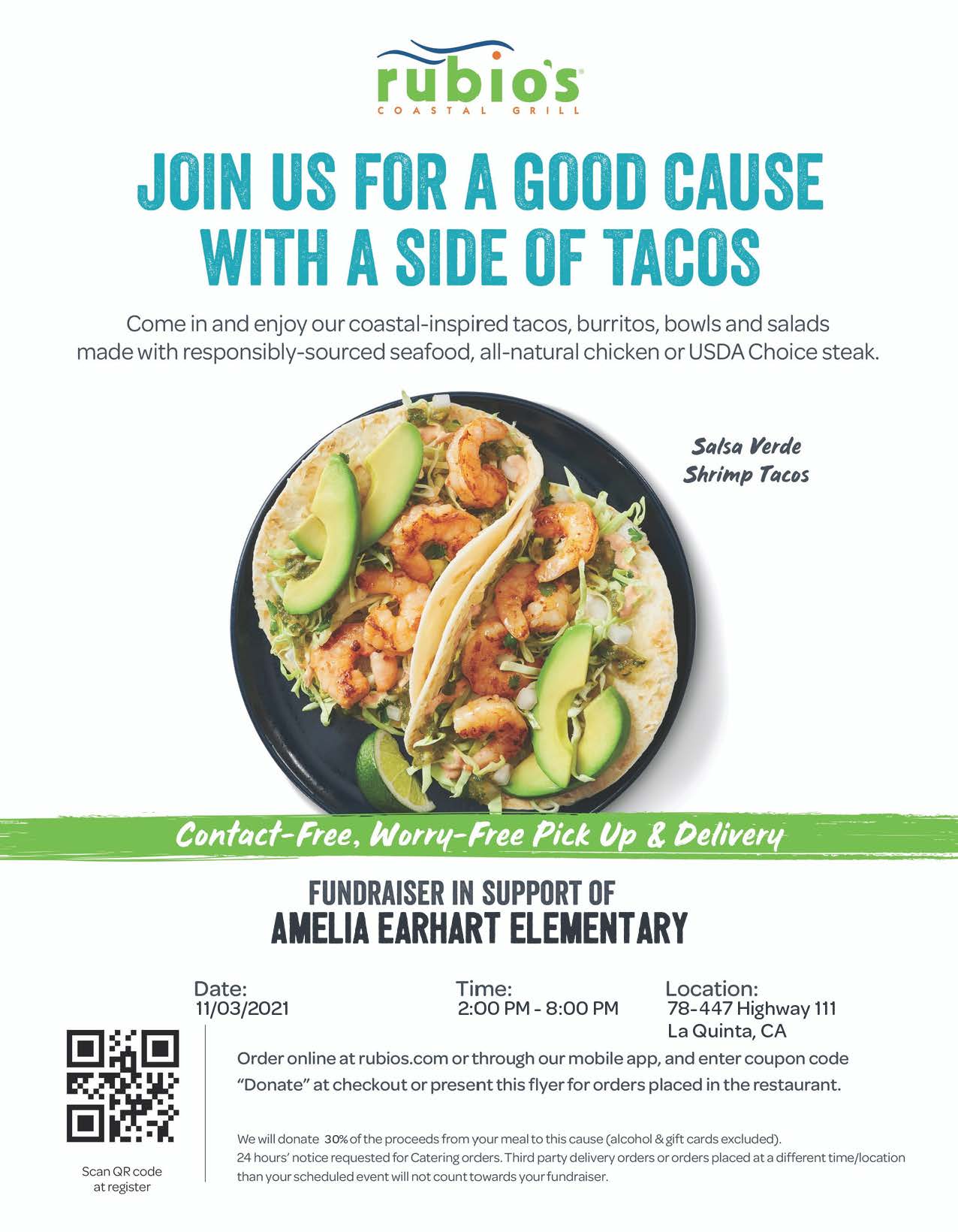 Join us on November 3, 2021 from 2:00 PM to 8:00 PM for a dine out at Rubio's in La Quinta.