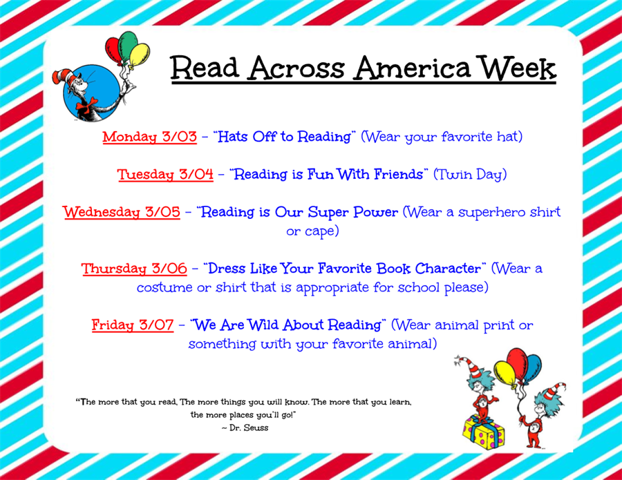 Thursday 3/06 - “Dress Like Your Favorite Book Character” (Wear a costume or shirt that is appropriate for school please)
