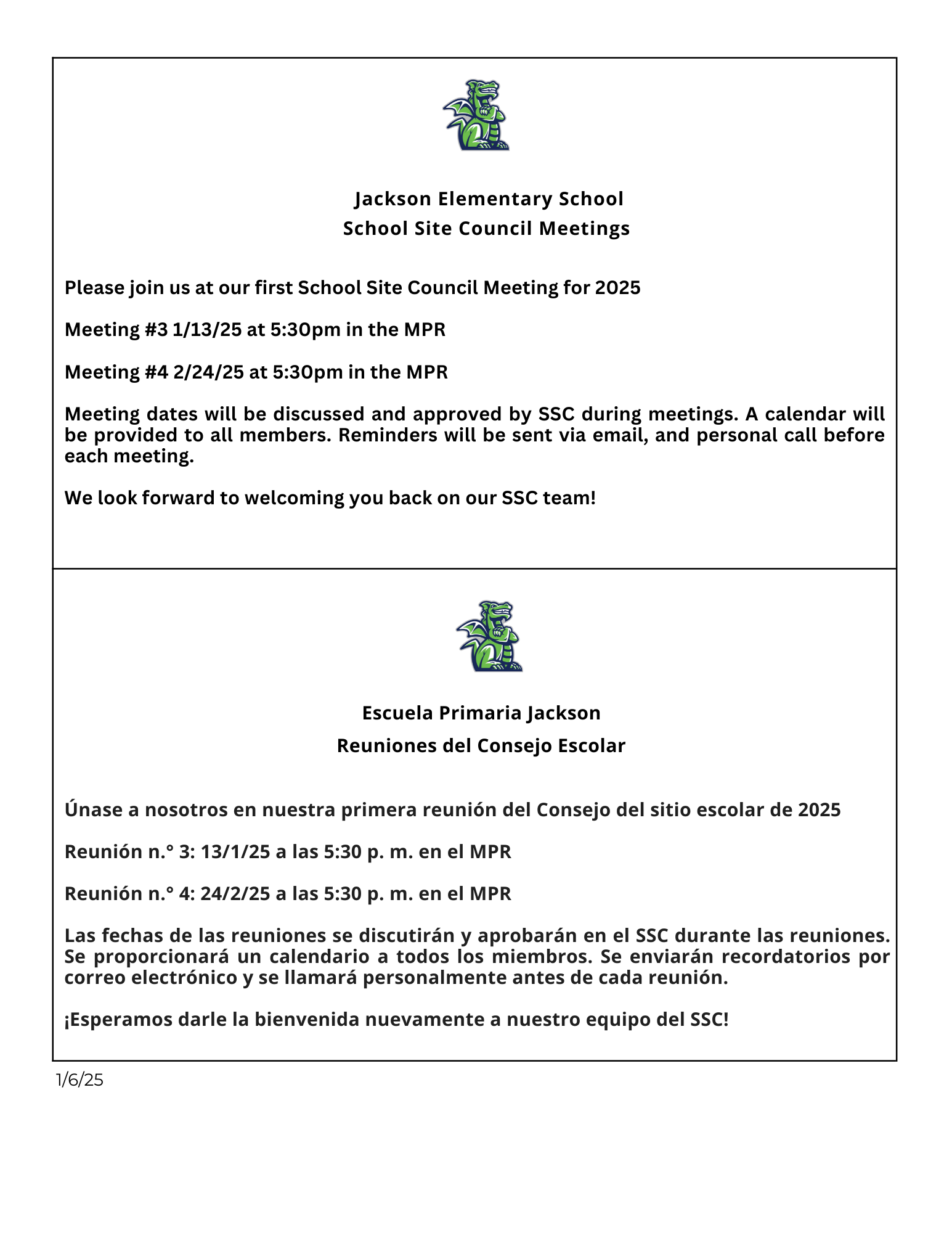 SSC Meeting 1/13/25 @ 5:30pm in MPR