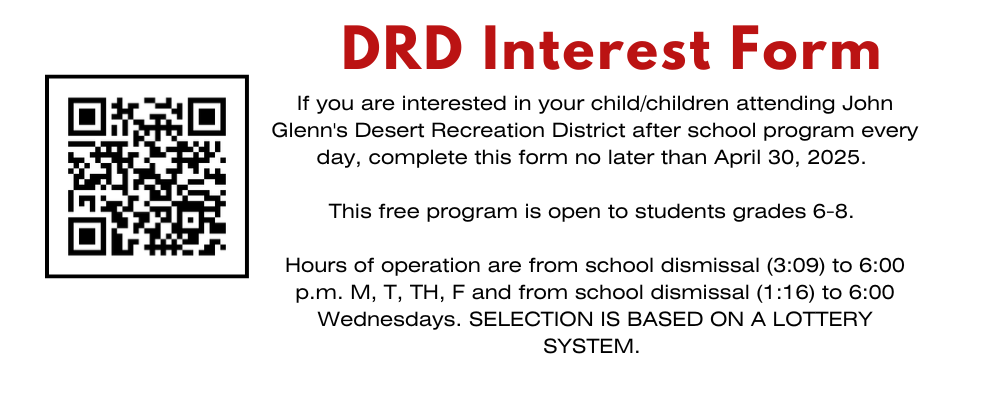 If you are interested in your child/children attending John Glenn's Desert Recreation District after school program every day, complete this form no later than April 30, 2025. This free program is open to students grades 6-8. Hours of operation are from school dismissal (3:09) to 6:00 p.m. M, T, TH, F and from school dismissal (1:16) to 6:00 Wednesdays. SELECTION IS BASED ON A LOTTERY SYSTEM.