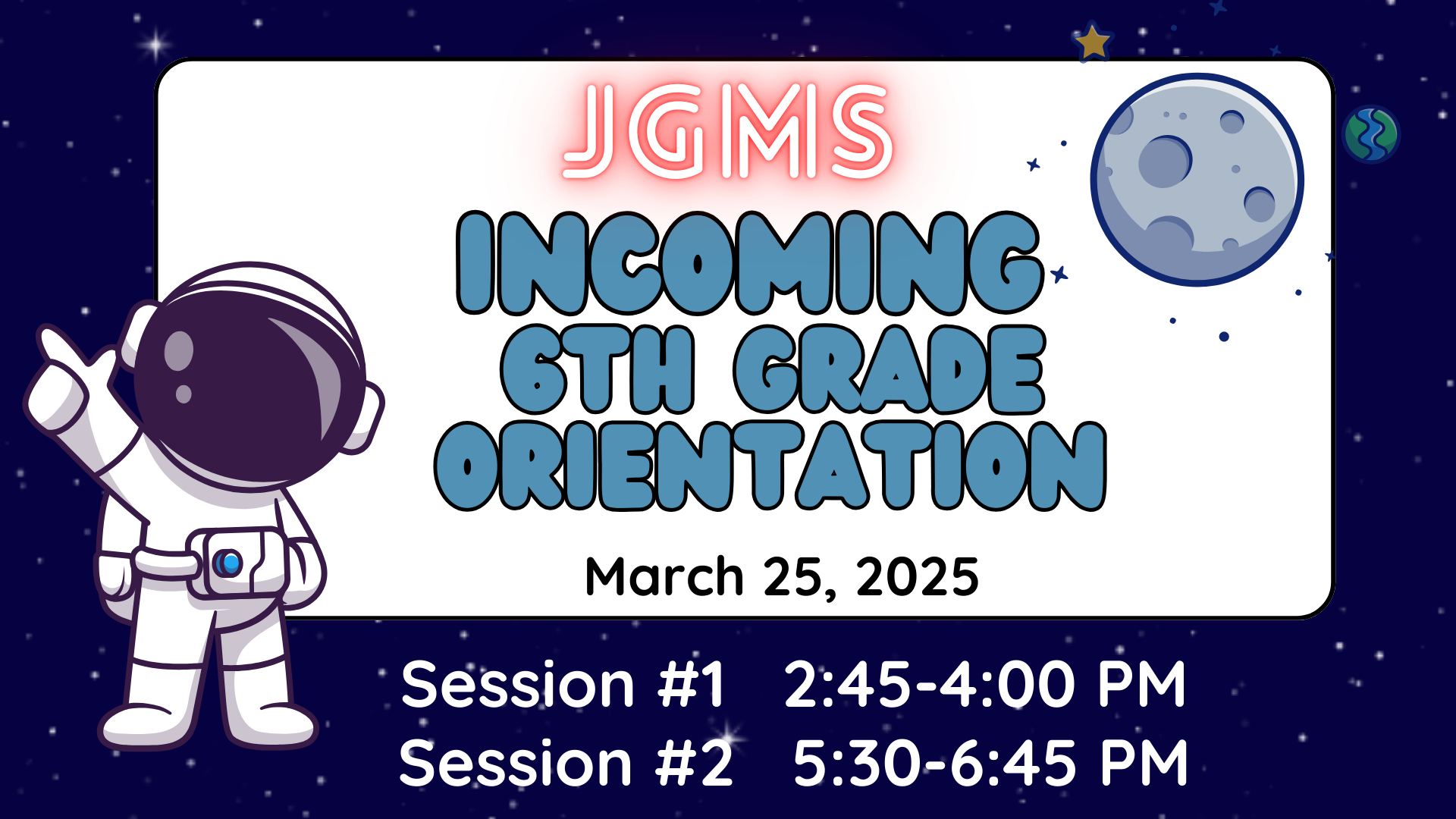 Please join us on Tuesday, March 25th for our Incoming 6th Grade Orientation. We will offer two sessions: 2:45-4:00 and 5:30-6:45. If you have applied for a transfer, but have not heard the status of your request, please plan on attending so you don't miss out on important information.