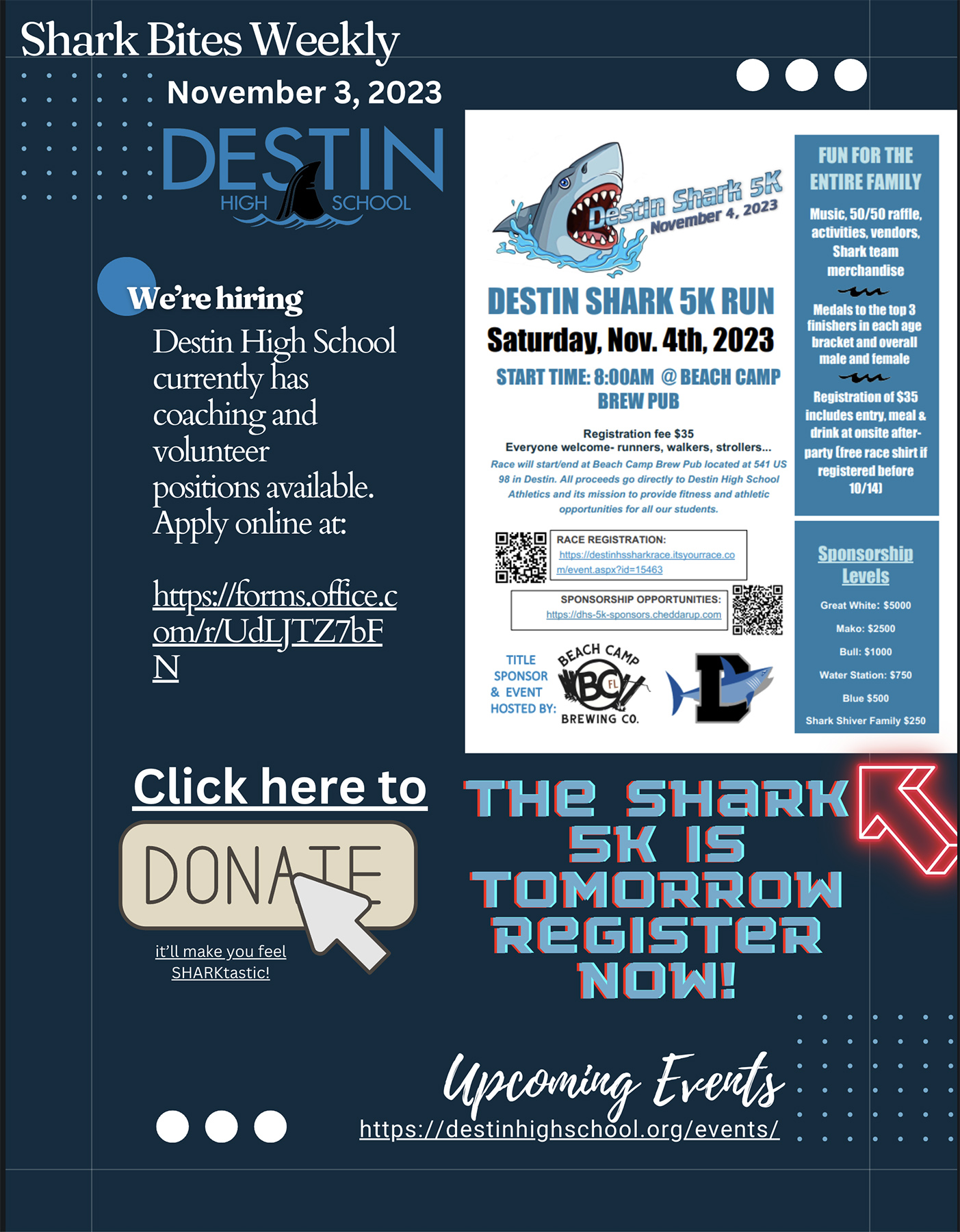 Destin High School2023-11-28T11:06:54-06:00We are so grateful for our sponsors! Thank you to these amazing Shark 5k sponsors!