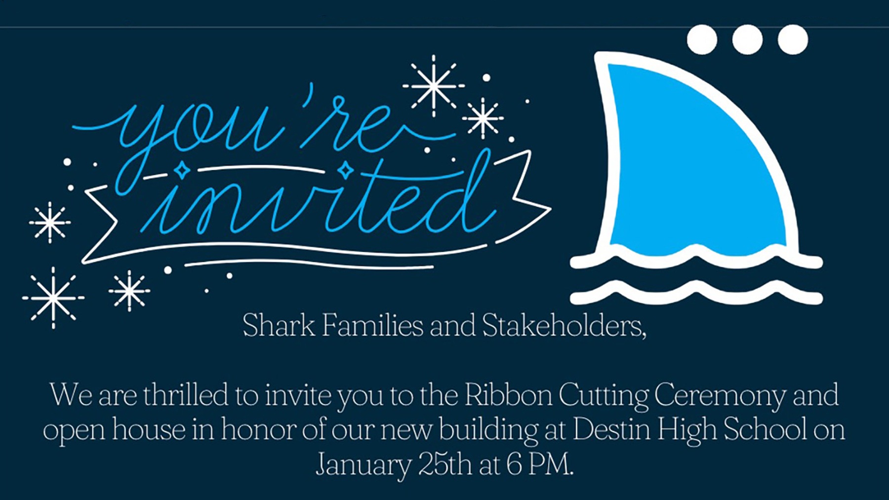 We are thrilled to invite you to the Ribbon Cutting Ceremony and open house in honor of our new building at Destin High School on January 25th at 6:00PM. This event marks a significant milestone for our school and we hope you are able to join us. Your presence would mean a lot to us as we celebrate this momentous occasion together. Date & Time: January 25th, 6:00PM Location: Destin High School, 4325 Commons Dr W., Destin, FL, 32541 We look forward to celebrating with you!
