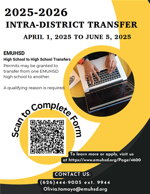 Intra-district permits will ONLY be accepted online @ www.emuhsd.org/intradistrict from April 1, 2025, through June 5, 2025.
