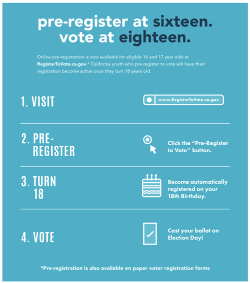 Online pre-registration is available for eligible 16 and 17-year-old students by visiting registertovote.ca.gov. California youth who pre-register to vote will have their registration become active on their 18th birthday.