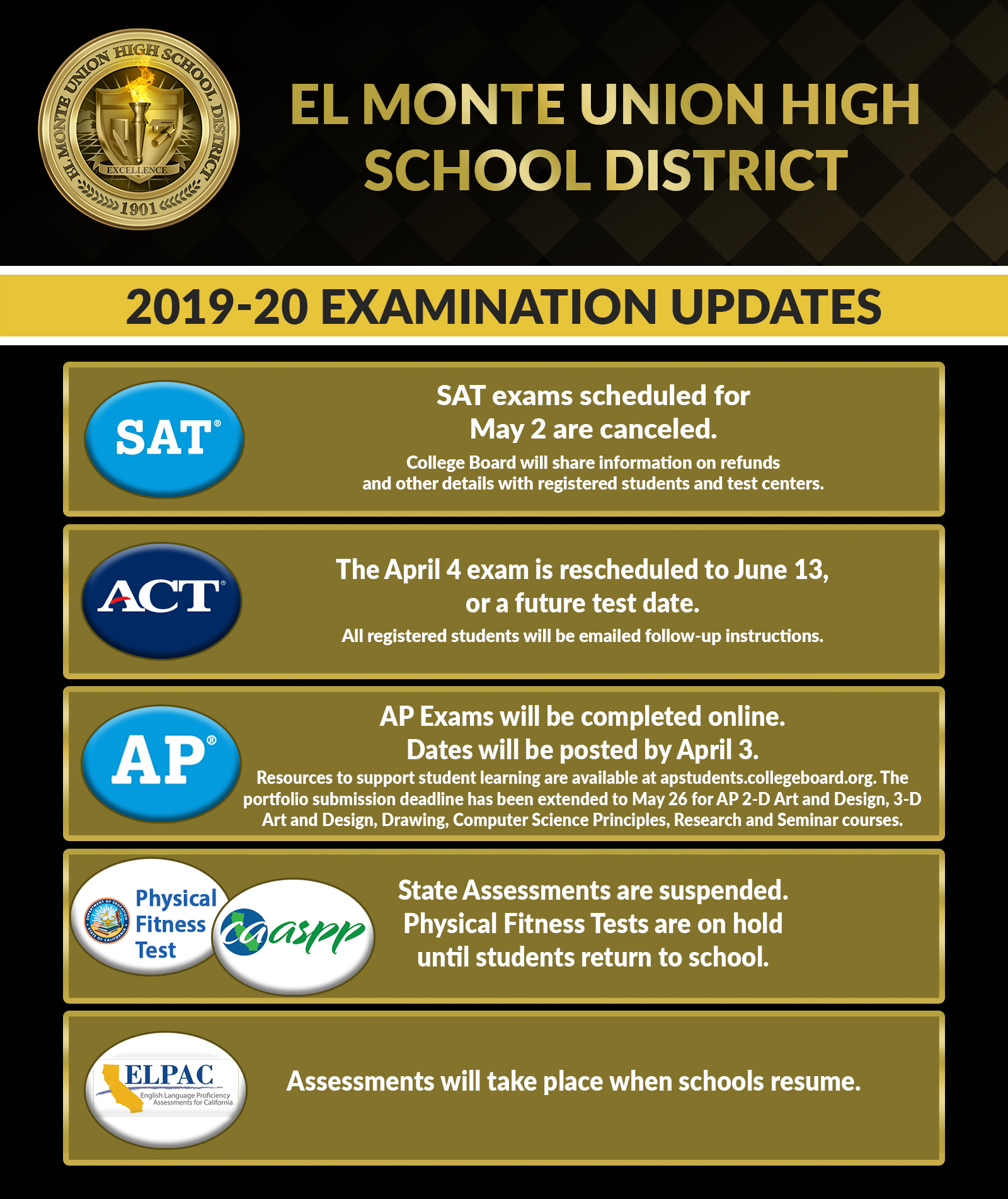 Spring is the time students usually engage in testing, but the COVID-19 pandemic has impacted several planned exams: state assessments have been suspended for the 2019-20 school year; AP exams will be administered online, with free review classes offered; SAT exams have been canceled through May 2; and the ACT has been rescheduled to June 13. CLICK each image to see more details on status of exams.