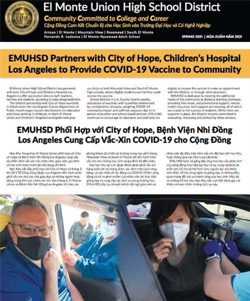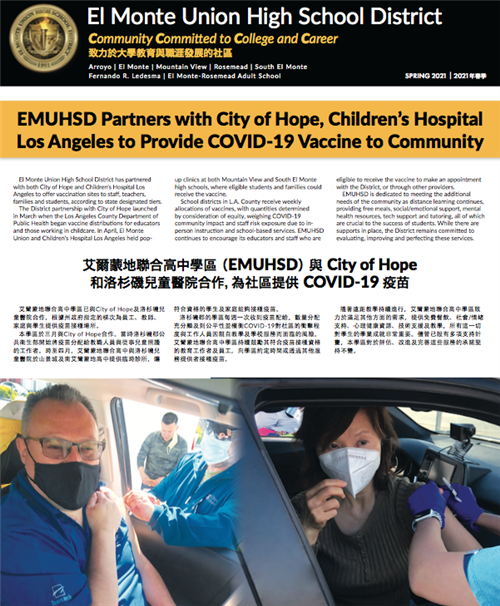 Superintendent's Update - April 2021: April is always an exciting month for the El Monte Union High School District, as scholars receive college acceptances, are awarded scholarships and gain national recognition for academic and athletic achievements. Our students have persevered through the challenges of the past year with incredible grit and determination. Learn more about what our teachers, staff and students are up to in our April Superintendent's Update! Our e-newsletter archive, including additional languages, is available here.