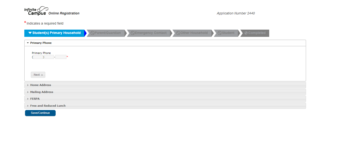 Begin filling out each form. You cannot access the next one down until you enter your information in the section you are in. For instance you must enter a phone number and click "next" before you can enter your home address. That section must be completed and you hit "next" before moving to the mailing address, and so on. Once you have completed all of the sections under a particular heading hit "Save/Continue" to move to the next heading. There are places inside registration to upload the required forms; ie: driver's license, proof of residency, custody/court papers, medical information, etc.