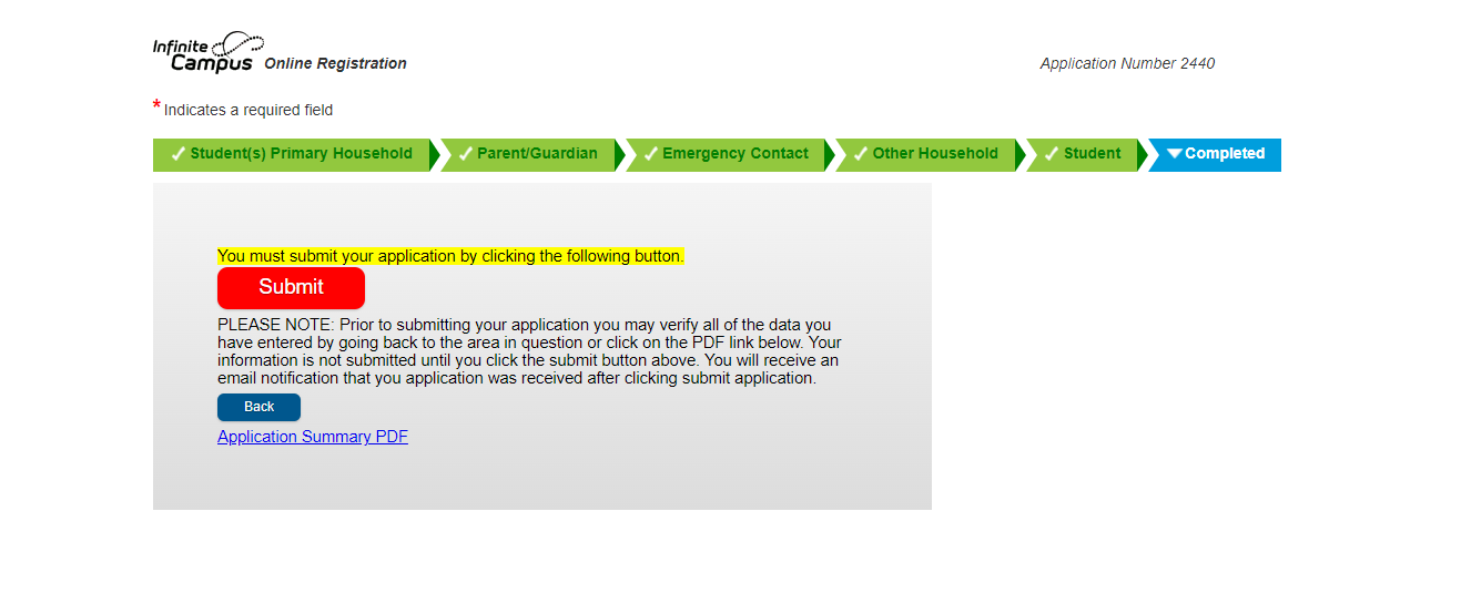 Once you have completed all of the sections and you have uploaded all of the required documents, you will see all of the headers turn green with a check mark. Hit "Submit" to compete your new student online registration.