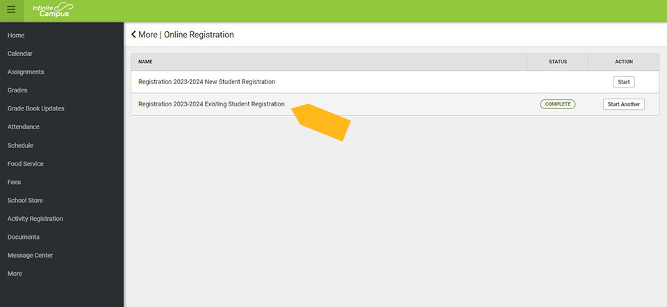 Then click on "Existing Student Registration" for the upcoming school year. It is very important that you click on "Existing Student," please be aware of the difference.