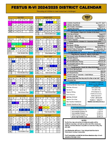 The Festus R-VI Board of Education approved the District calendar for the 2024-25 school year at its meeting on Thursday, February 15, 2024. Highlights of the calendar include: