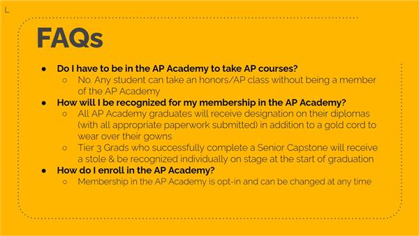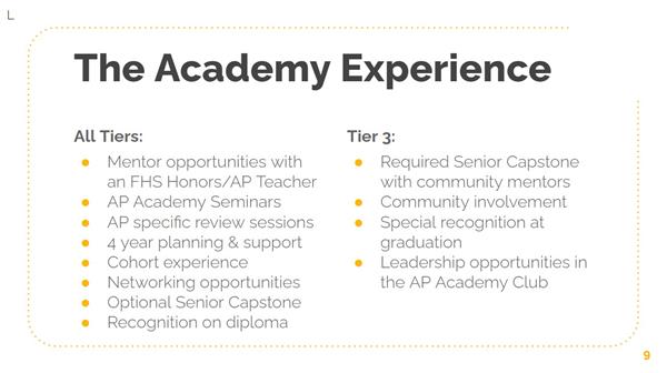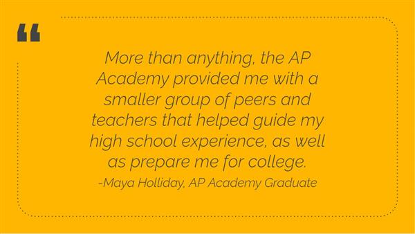 Are you ready for a unique learning experience that will enable you to succeed in college?The AP Academy will expose you to challenging college level courses and exams where you can earn college credit, stand out in the admission process, gain valuable preparation for succeeding in Tier 1 universities, and learn from College Board approved instructors!The AP Academy also offers students an opportunity to connect with their peers and make a difference in their community through Guest Speaker events and the Senior Capstone Project.Challenge the Experience