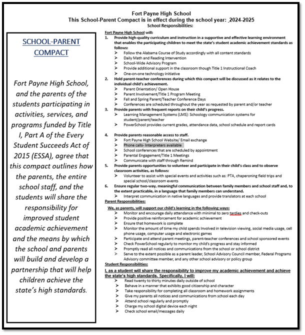 Fort Payne High School will provide individual academic achievement results and interpretation of the results in a language that the parent can understand at the parent’s request. For additional information regarding this subject please contact your school Guidance Counselor.