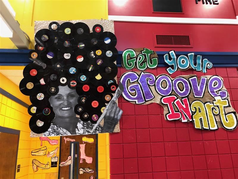 Get your groove in art. My name is Lindy Vizzinia but to WVES students I am Mrs .Art! This year our art room depicts the Motown and disco days. From black and white checked stages, a BIG Disco Duck, tie dye spiral material floor to ceiling , a big piano board, and color wheel big paintbrushes our art room is peaceful and groovy. Thanks to Pete The Cat donations from the T shirt sales we now have BLACKOUT curtains. These curtains make our black light art creations so bright!!