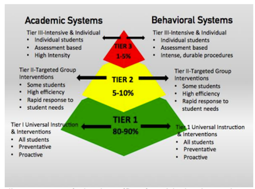Response to Intervention (RtI)/Multi-Tiered System of Supports (MTSS) integrates assessment and intervention within a multi-level prevention system to maximize student achievement and to reduce behavioral problems. With RtI, schools use data to identify students at risk for poor learning outcomes, monitor student progress, provide evidence-based interventions and adjust the intensity and nature of those interventions depending on a student’s responsiveness. A three-tiered model of intervention within the general education curriculum is applied, which includes academic as well as behavioral interventions. The core principles of RtI applied within the tiered framework of intervention are 1. Universal screening, 2. Intervention, 3. Progress monitoring, 4. Intervention efficacy and fidelity.
