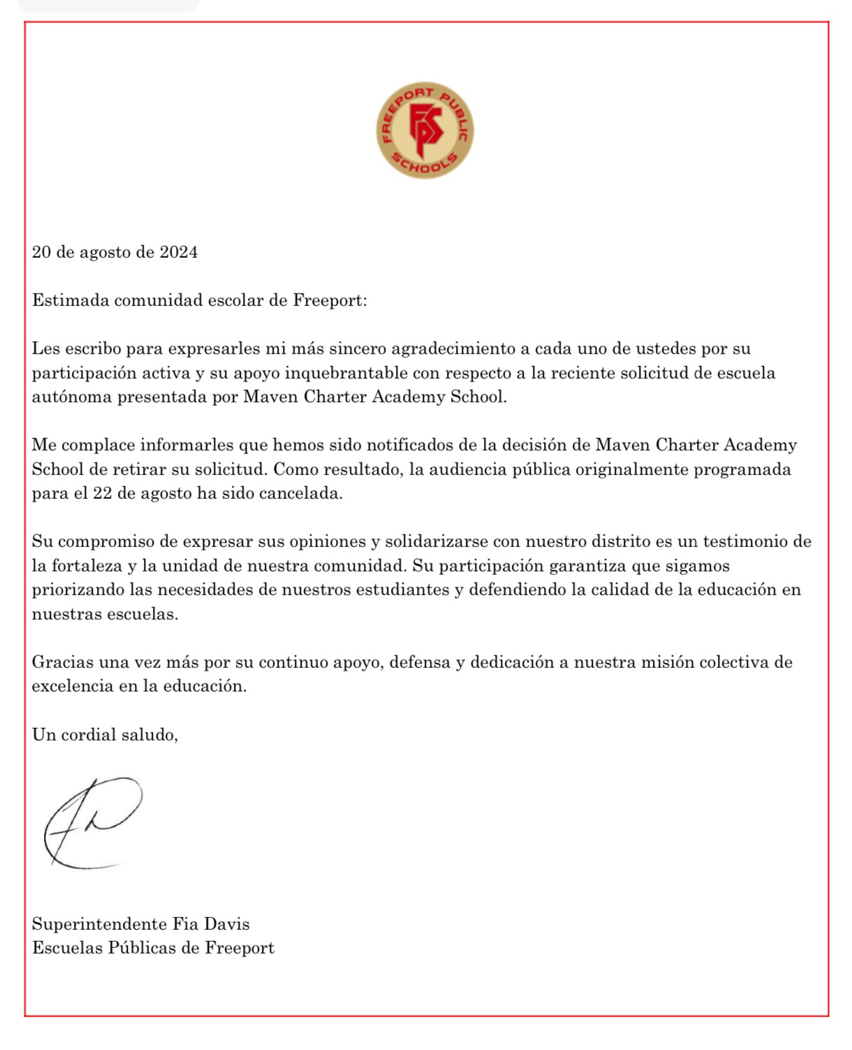 Welcome back by Superintendent Davis