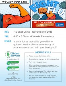 On Thursday, November 8 there will be a flu shot clinic open to students and community members from 4:00-6:00pm in the Veneta Elementary Library.