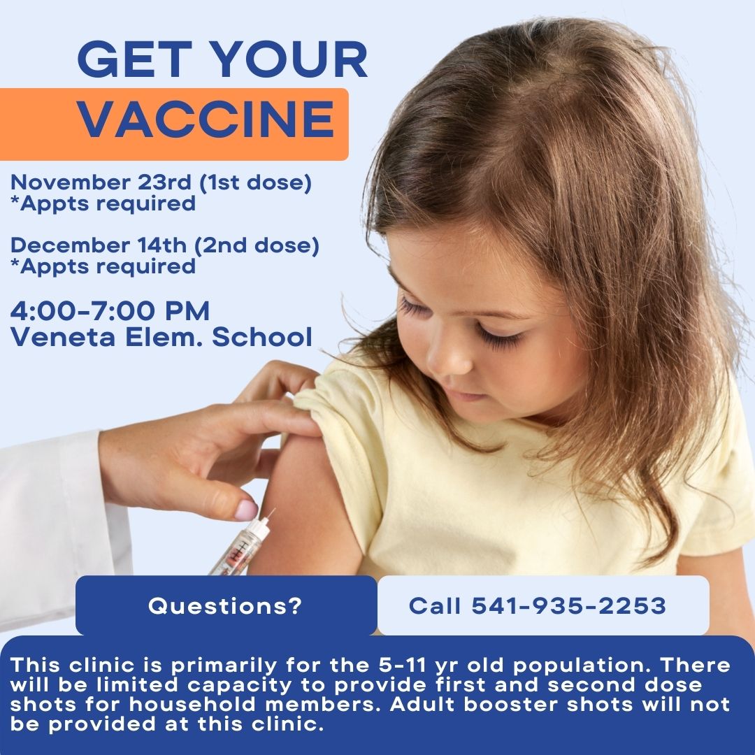 - Vaccination Clinics will be put on by Lane County Public Health and will be primarily for 5-11 years. There will be limited supply for siblings outside of this age category/parents in the same household.