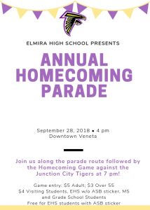 The parade route begins in the parking lot near Cup of Joe and will make its way through downtown Veneta before finishing at the high school. Come join our students, staff and community members in support of our Elmira Falcons as they take on the Junction City Tigers!