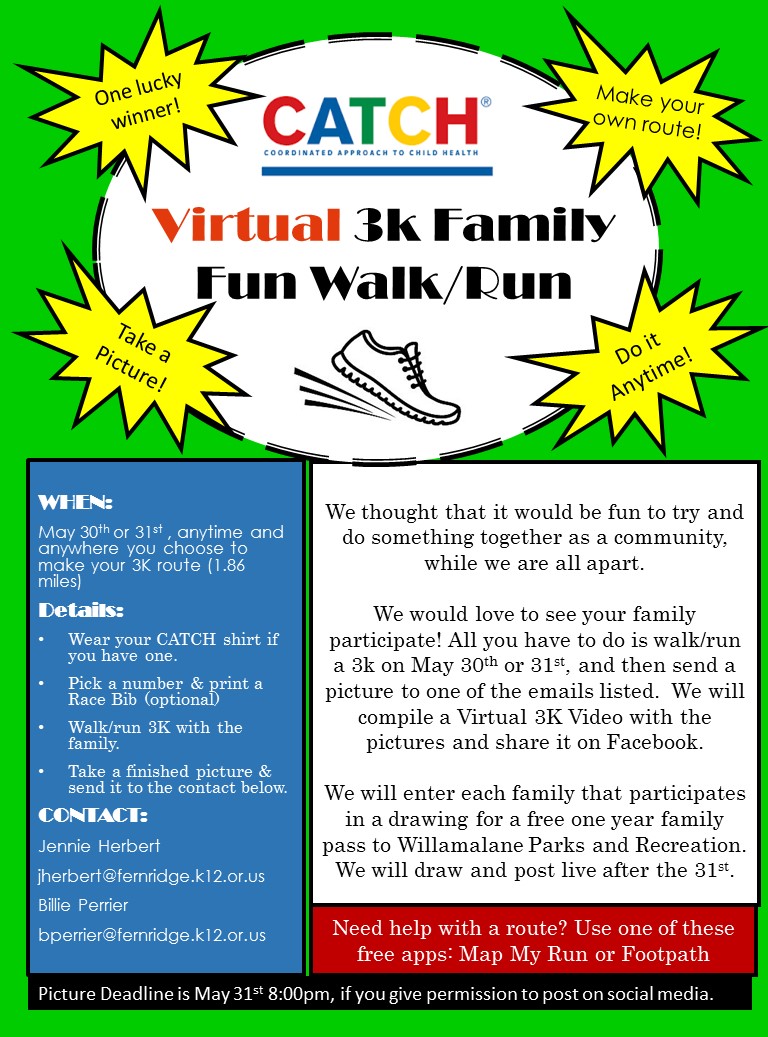Mrs. Herbert and Mrs. Perrier from EES are planning a 3k virtual fun run! The flyer below includes most of the information you need. Also included at the bottom of this post is a “virtual bib” and a “virtual finished picture banner.” You do not NEED either one of these items, but they are there for your convenience and fun if you want one. The bib can be printed (with any number you want)–and worn when you run, and the “banner” can be held up when you and or your family finish your run and want to take a picture! The pictures can be emailed to the email address on the flyer. Anyone that sends in a picture will be eligible for a grand prize drawing of a one year Family Pass to Willamalane Parks and Recreation. The pictures sent in will also be used in a video that will go out on social media. If you want to be included in the drawing, but not in the social media posts, just mention that in the email that you send.