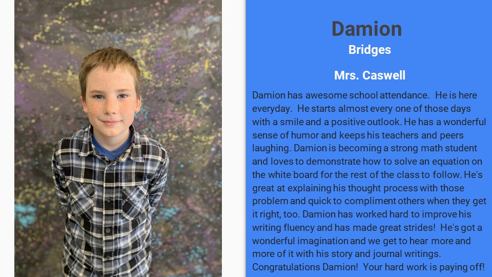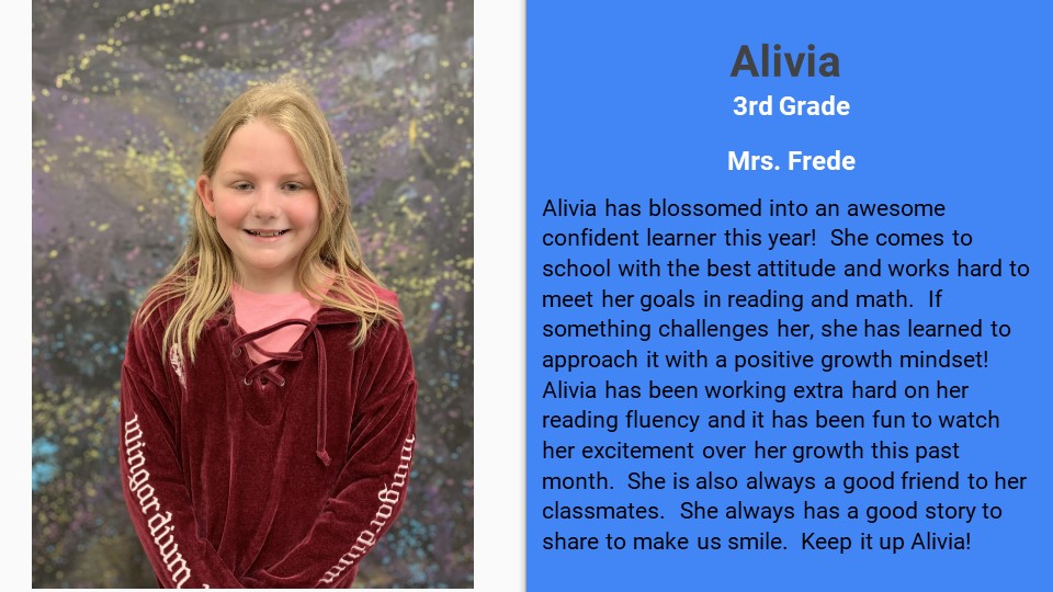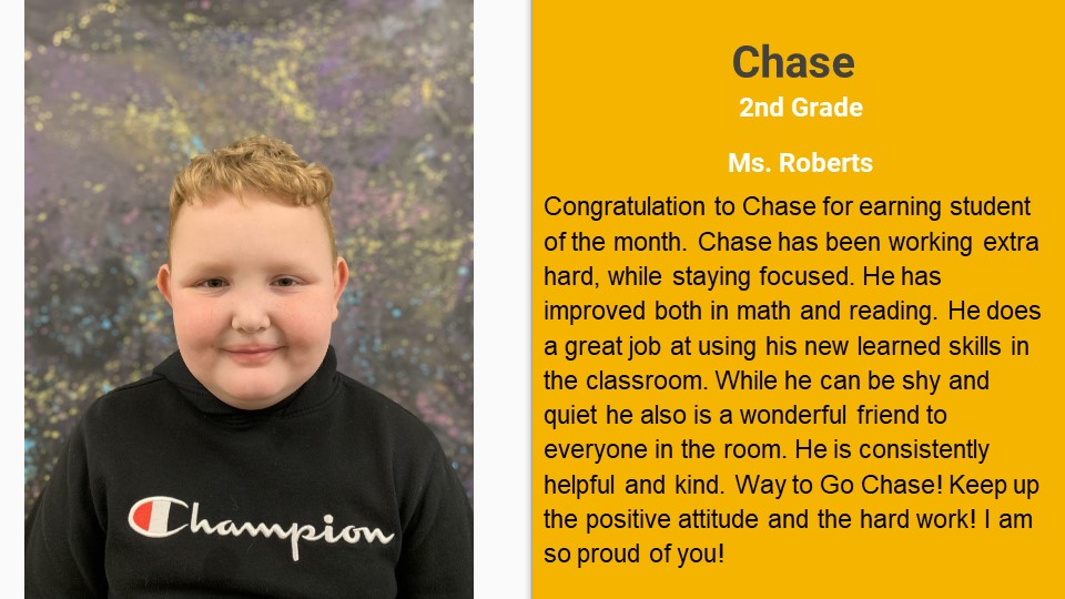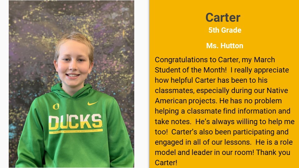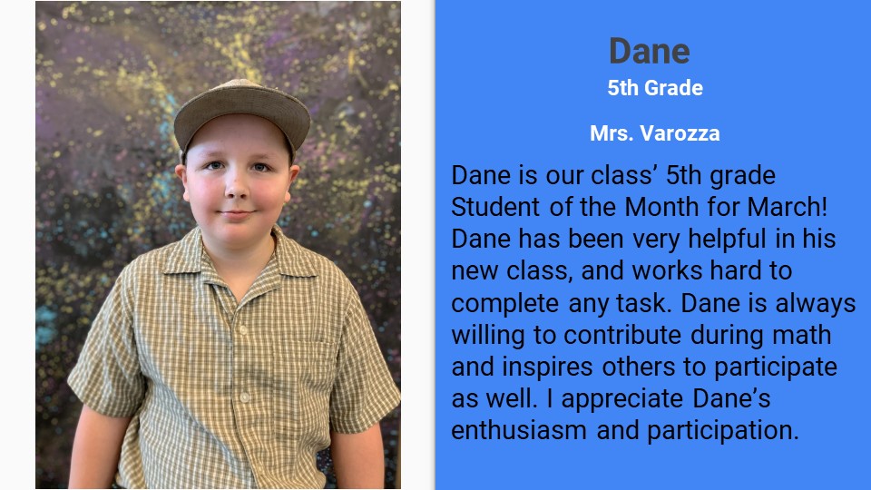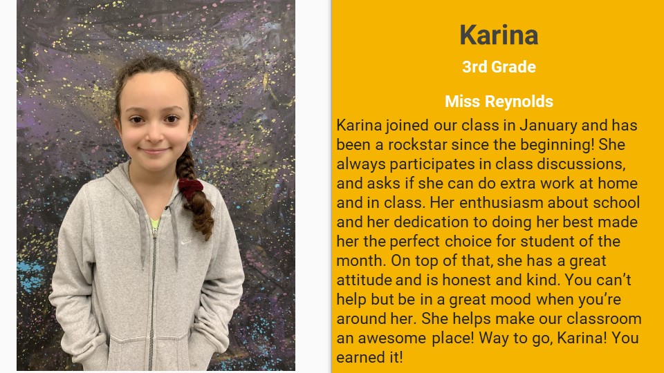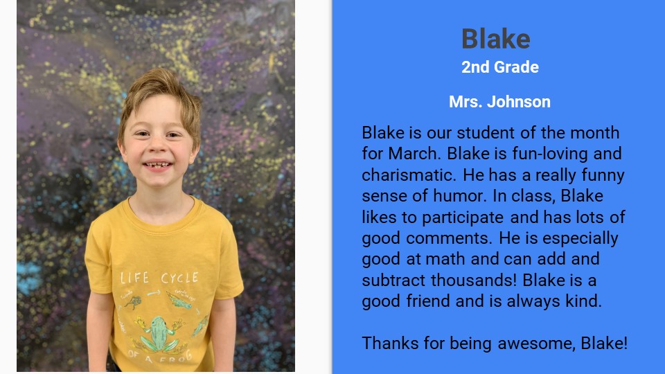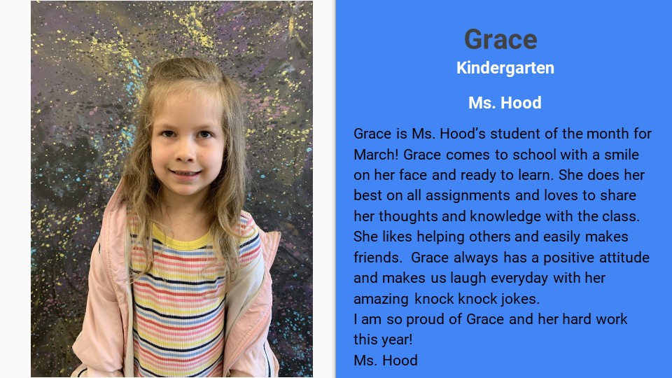 Congratulations to our students who earned Student of the Month for March! As we navigate through this unusual year, we are proud of students who are working hard every day!
