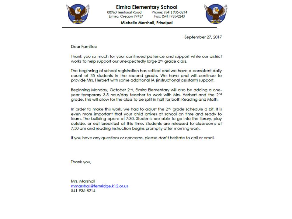 More support for 2nd grade! As many of you know, we have 35 students in our 2nd grade class with Mrs. Herbert. Beginning Monday, Oct. 2, we will be adding a 3.5 hr/day licensed teacher to help teach math and reading. Thank you to everyone for your support and patience as we problem solve!