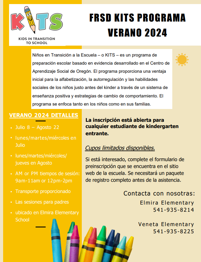 We have 8 spots left in the KITS program. Please contact Veneta Elementary School or Elmira Elementary school for more information.