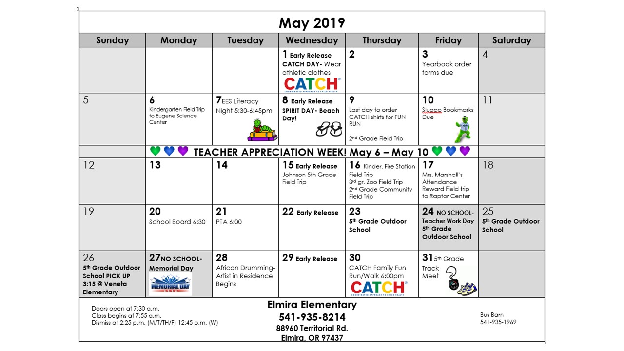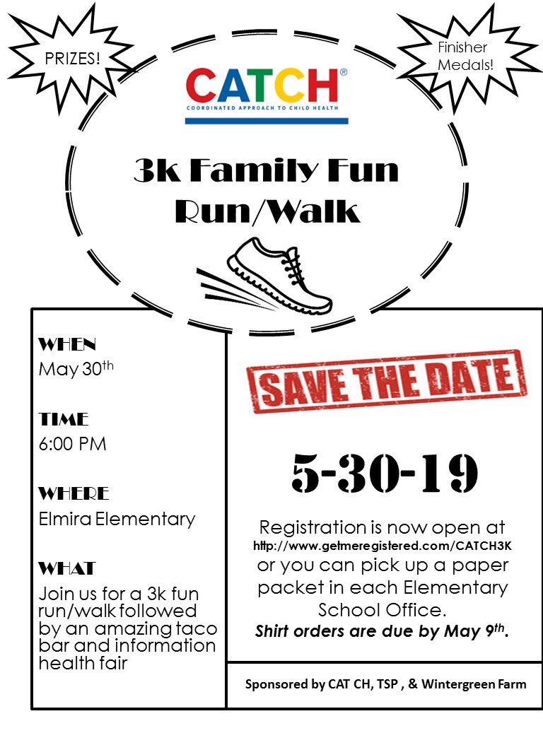 Mark your calendars for May 30th and join us for a 3K Family Fun Run/Walk followed by a taco bar and health information fair! This event is sponsored by Coordinated Approach to Child Health (CATCH) and will be held at Elmira Elementary School.