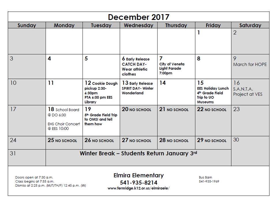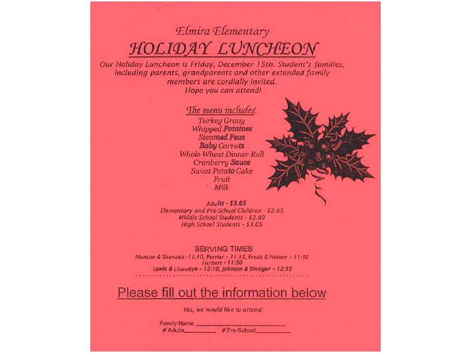Elmira Elementary Holiday Luncheon Holiday Luncheon this Friday! Kindergarten 11:10, 1st grade 11:15, 2nd grade 11:50, 3rd grade 11:30, 4th grade 12:10, and 5th grade 12:35. Holiday luncheon