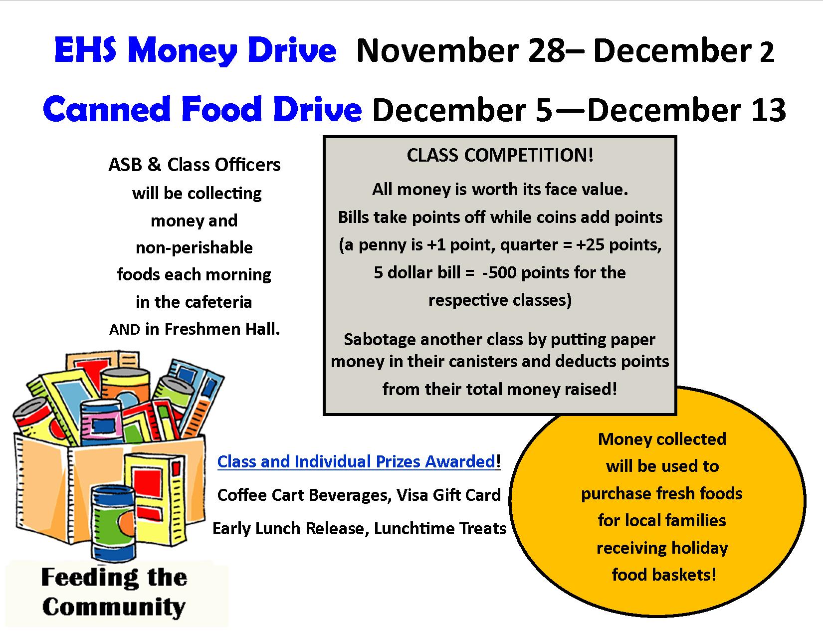 Next week, the EHS student leadership class begins it’s annual Food and Money drive to support the local Kiwanis Holiday Food Drive. Please see the flyer below if you are are able and willing to participate. The first week is a “Money Drive” and Dec 5th-13th we will be collecting non-perishable food items. Go Falcons!