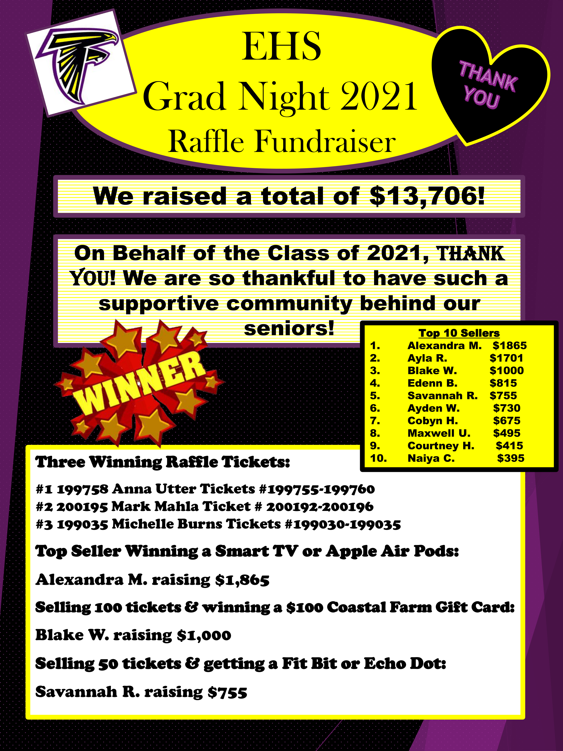 Congratulations to the prize winners from our Senior Grad Night Raffle. Please refer to the attached flier to see the winners.