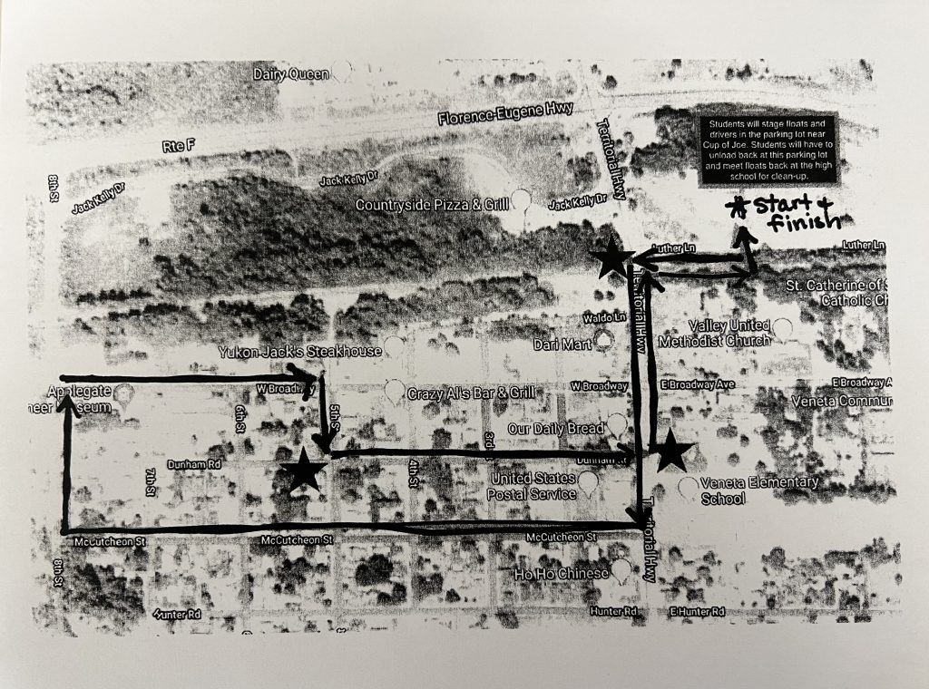 Elmira High School’s homecoming parade route will begin at Cup of Joe at 4:00 pm heading west on Luther Lane. The floats will then: