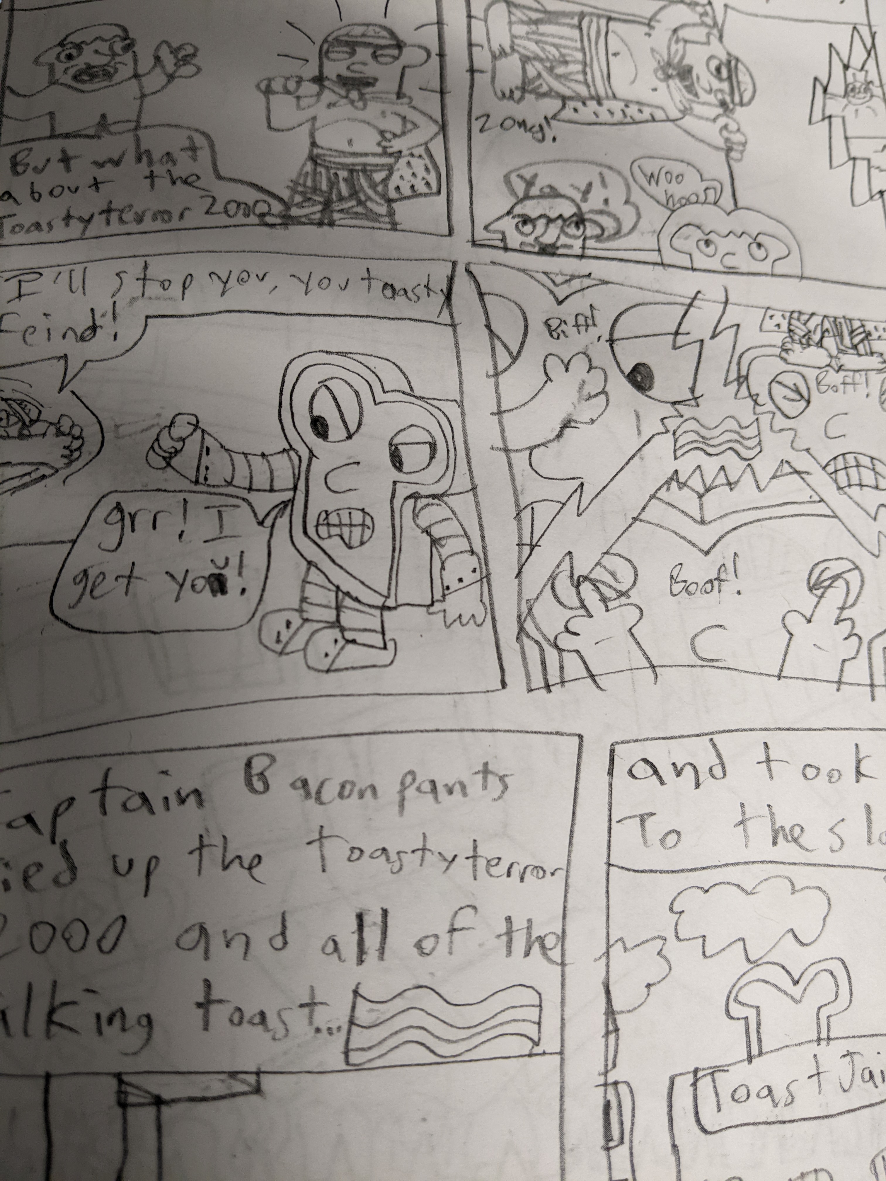 He is currently working on a set of comic books inspired by some of his favorite books, the Captain Underpants series by Dav Pilkey. Jack has created his own character, Captain Bacon Pants and plans to feature him in a series of 12 comic books. Each comic book features Captain Bacon Pants fighting crime against criminals like The Talking Toast. Jack writes and