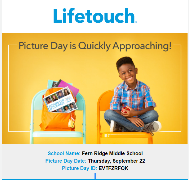 Fern Ridge Middle School will have their picture day on Thursday, September 22nd. Information packets and order forms will be sent home this week or families can order pictures online at lifetouch.com using the code EVTFZRFQK