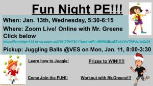 Join Mr Greene on Wednesday, January 13th, at 5:30pm for a Zoom lesson in juggling!