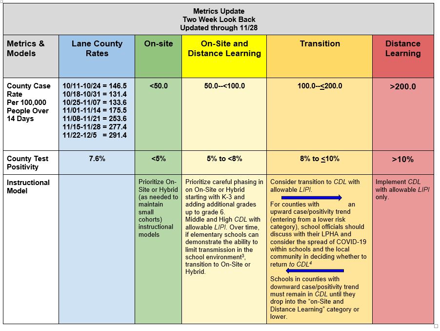 It has been a while since we have posted the updated 2-week lookback return to school metric “table.” Below is that graphic with updated information as of today. It shows that Lane County has continued to report a rising number of COVID-19 infections. District administrators are meeting regularly to review these metrics and review them with our staff. The goal will be to share by Friday, December 18th, what the plan will be when school resumes in January.